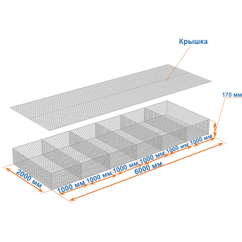 Матрасы Рено 6x2x0,17 — плоские габионные секции из сетки двойного кручения с ячейкой 80х100, проволокой 2,7 мм и покрытием Цинк.